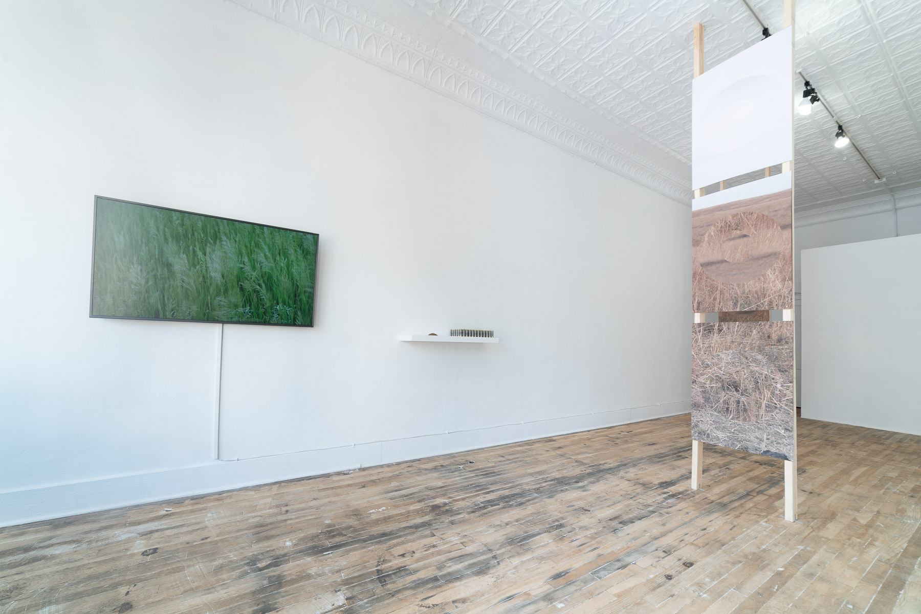 displayed at Generator Space, Omaha, NE, Summer 2021Inspired by what was once a sprawling sea of grasses stretching from the Rocky Mountains to the Mississippi River where flora and fauna thrived, this exhibition examines the prairie and the colonization that whittled it down to 1% of what it once was. ditch seed introduces a mysterious figure meandering the prairie collecting seeds and disseminating them with a customized shotgun. Invoking firearms’ brutal role in decimating the buffalo and the Native people of the prairie, this character’s sisyphean attempt to reseed this ecosystem reimagines a violent tool of colonization into a reparative gesture. Images of the prairie are fragmented, distorted, and installed to reference a shooting range culminating into both an elegy for a prairie lost to forces of violence and erasure; and a call for restoration and healing.